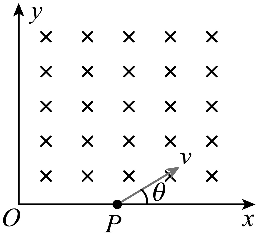 17、如图所示,在直角坐标系第I象限中有磁感应强度B=0.20T方向垂直纸面向里的匀强磁场,一带正电粒子以速率v=25m/s从x轴上P点垂直于磁场方向射入,已知速度v与x轴的夹角θ=30°,P到坐标原点O的距离L=0.25m,粒子所带电荷量q=3.0×10-15C,质量m=6.0×10-18kg,π=3.14,不计粒子重力,求: