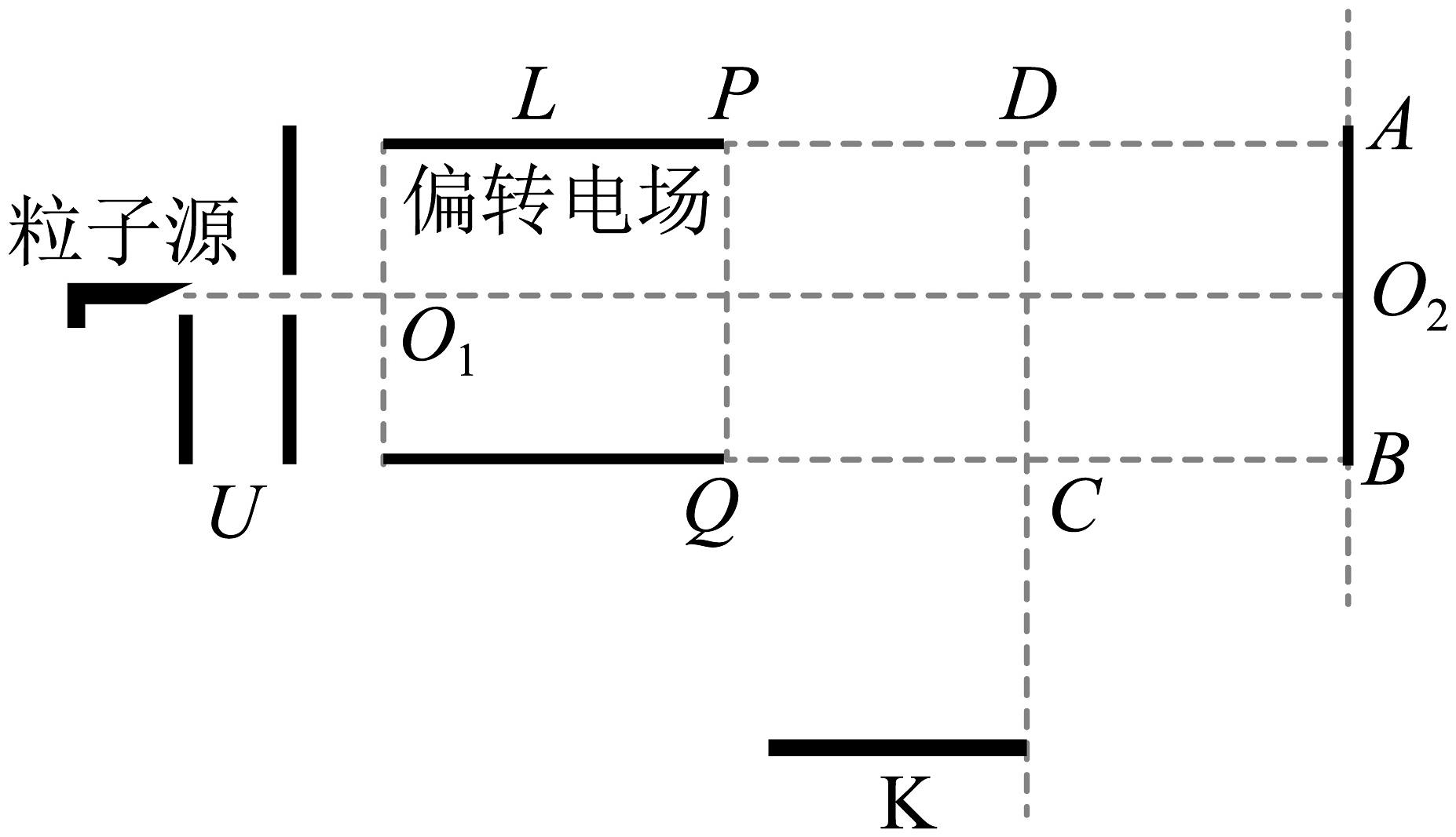3、如图所示,真空中有一粒子源,能够连续不断的发出质量为m、电荷量为q、初速度为零的带电粒子,带电粒子经电压为U的加速电场加速后,沿偏转电场两极板间的中心线O1、O2射入电压为2U的偏转电场,刚好从偏转电极下极板右边缘Q点飞出。已知偏转电极的极板长度为L,荧光屏AB到偏转电极极板右边缘的距离PA=2L,图中AB=PQ=DC,且C、D为QB、PA的中点,不计粒子重力及粒子间相互作用.