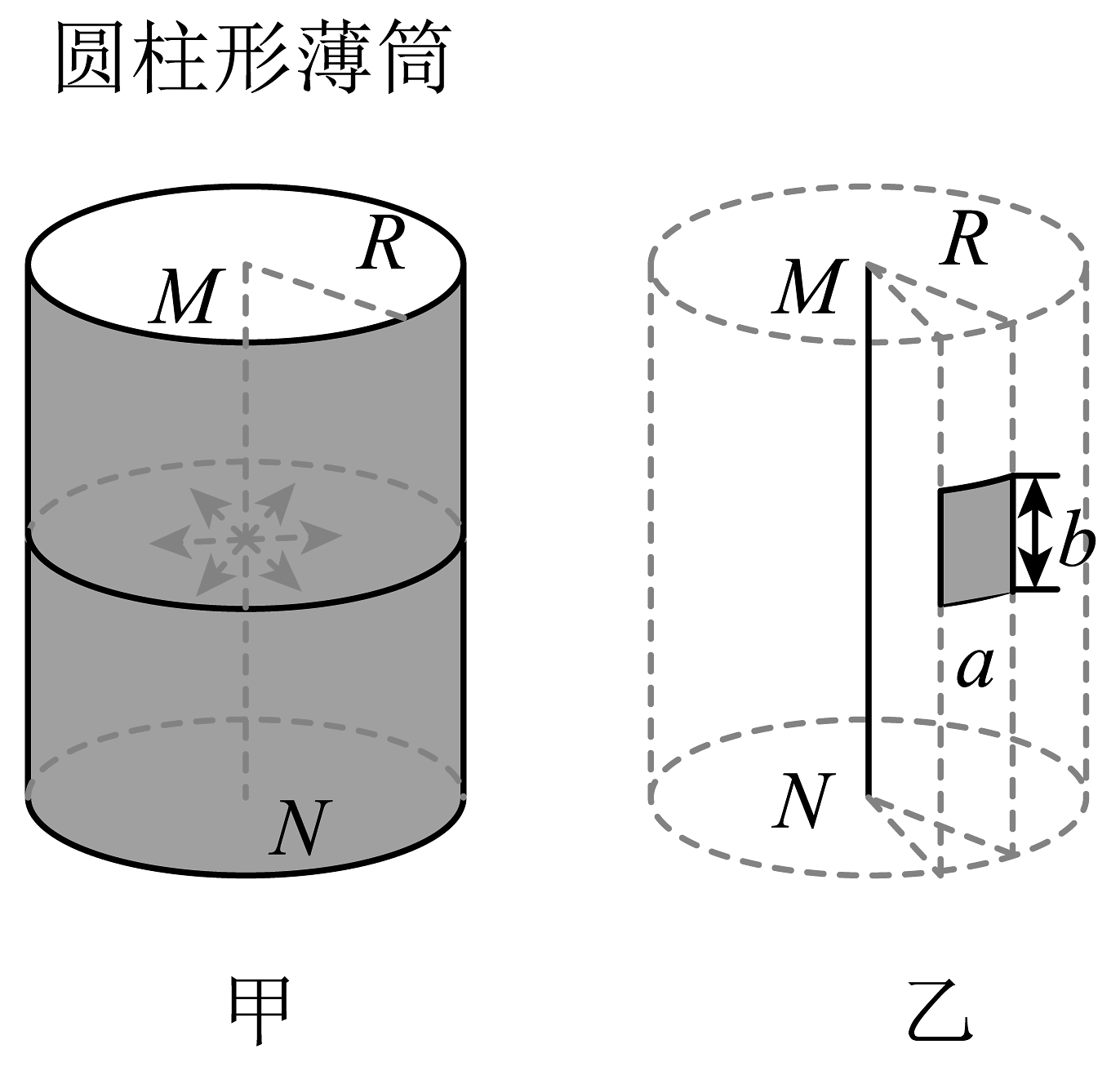 5、如图甲所示,一抽成真空的圆柱形薄筒,中心轴处有一细长直的紫光线光源。沿柱面位置放置一个弧长为a、长度为的光膜片,如图乙,光照到光膜片上形成的压强为p。为了简化问题,假设线光源只沿径向均匀射出紫光,光照到光膜片上,一部分被吸收,其余被完全反射,吸收率为。已知普朗克常量为 , 紫光频率为 , 光速为 , 则单位时间内照到光膜片上的光子数为( )A、 B、 C、 D、