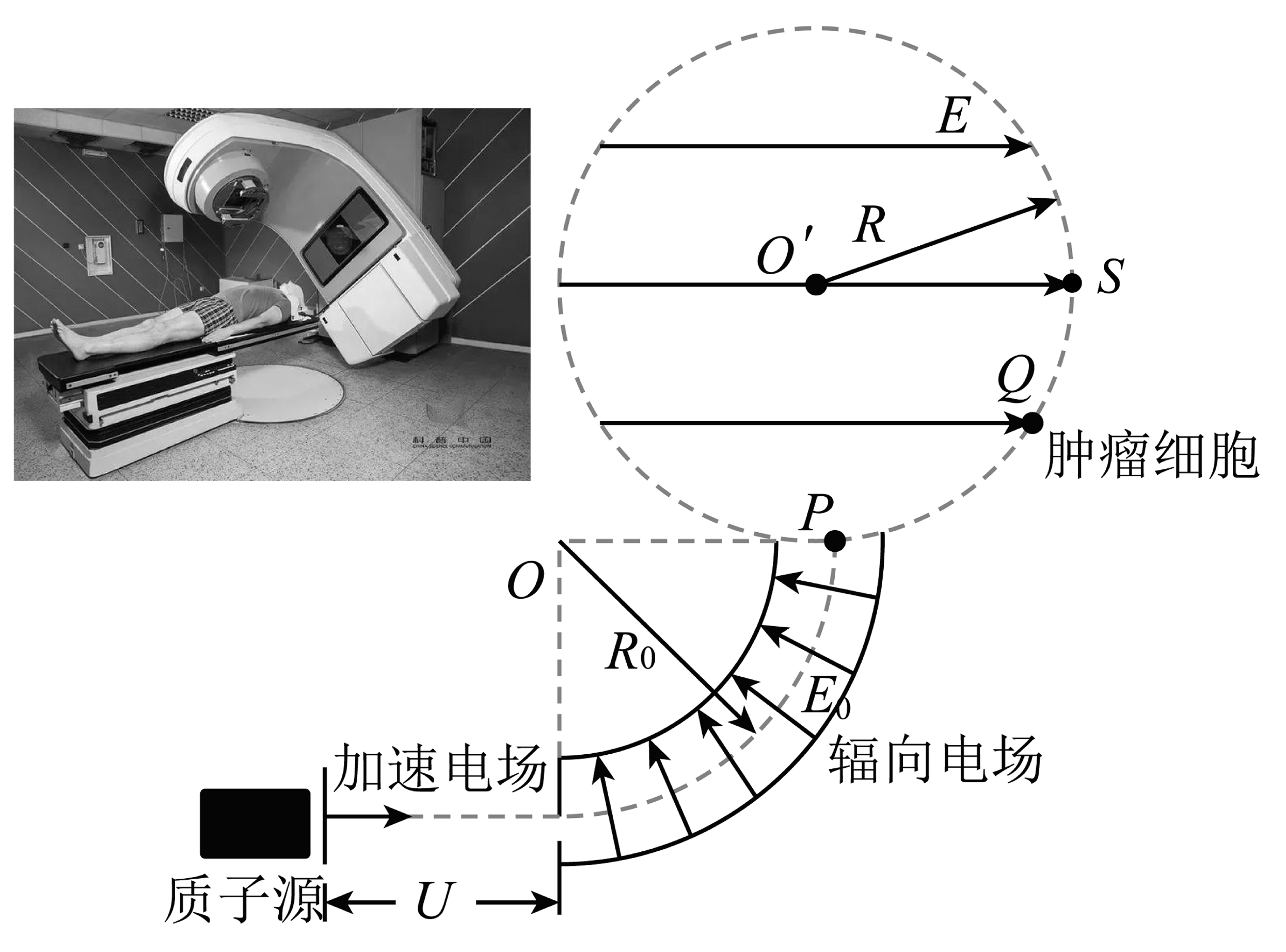 18、某些肿瘤可以用“质子疗法”进行治疗。如图所示,来自质子源的质子初速度为零,经加速电压U加速后,沿图中四分之一圆弧虚线通过辐向电场,再从P点竖直向上进入存在水平向右的匀强电场的圆形区域,最终轰击处在圆上Q点的肿瘤细胞。已知四分之一圆弧虚线处的场强大小为E0 , 方向沿半径指向圆心O,圆O'与OP相切于P点,OP = R0 , 圆形区域的半径为R,Q点位于OP上方处,质子质量为m、电量为e。不计质子间相互作用,则下列说法正确的是( )A、在辐向电场中做匀速圆周运动,速度大小 B、在加速电场中做匀加速直线运动,电压 C、在匀强电场中做匀变速曲线运动,场强 D、若肿瘤细胞位于圆上S处(OP上方为R),只需将电压调整为就能击中