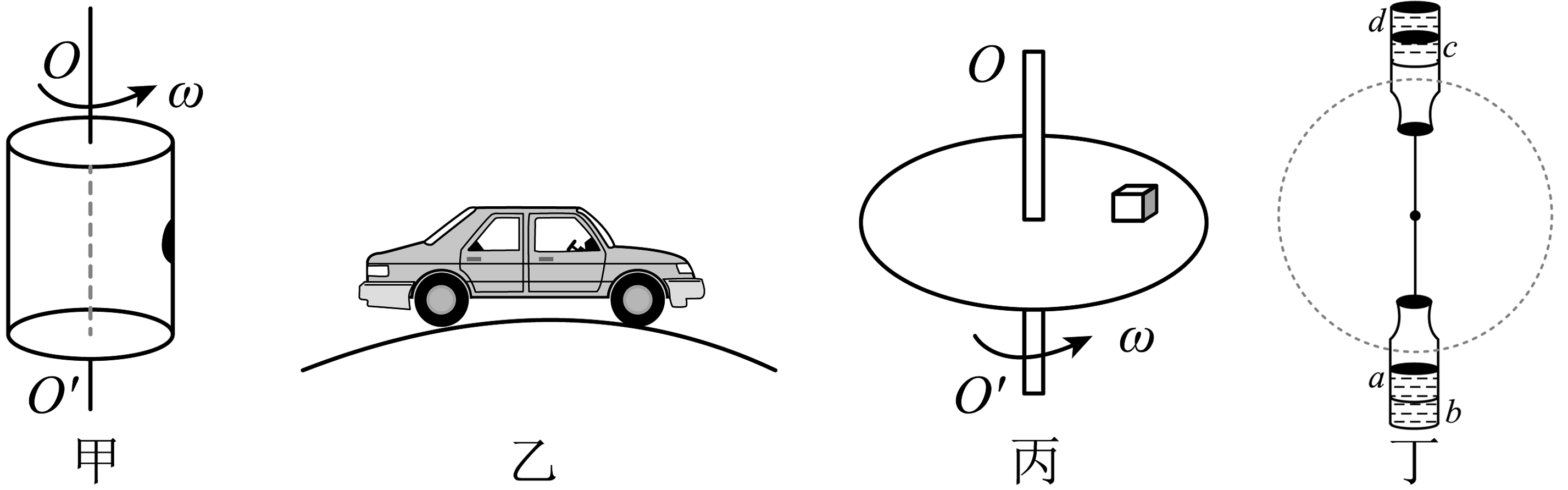 5、下列有关生活中圆周运动的实例分析,说法正确的是( )A、图甲中,附着在脱水桶内壁上随筒一起转动的衣服受到的摩擦力随角速度增大而增大 B、图乙为汽车通过拱桥最高点时的情形,汽车受到的支持力小于重力 C、图丙为水平圆盘转动时的示意图,物体离转盘中心越远,越容易做离心运动 D、在空间站用细绳系住小瓶做成“人工离心机”可成功将瓶中混合的水和食用油分离,其中b、d部分是水
