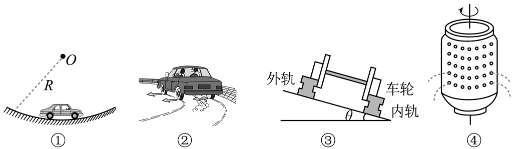 17、下列关于教材中的四幅插图说法正确的是( )A、甲中汽车通过凹形路面时,汽车需减速,这样可以减少对桥的压力 B、乙中汽车在水平面内转弯时,由地面的滑动摩擦力提供转弯所需的向心力 C、丙中在铁路转弯处的外轨比内轨高,可以减轻转弯时火车外侧轮缘与轨道的挤压 D、丁中洗衣机脱水桶脱水的原因是水滴受到的离心力大于它受到的向心力