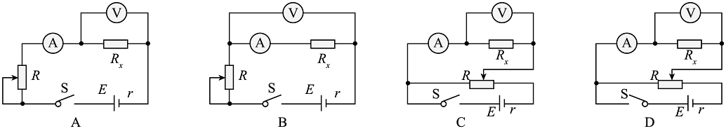 实验要求电压电流从零开始测量,用改装好的电压表组装电路,滑动变阻器选择(选填序号字母)。以下电路图中应当采用的最佳电路为。