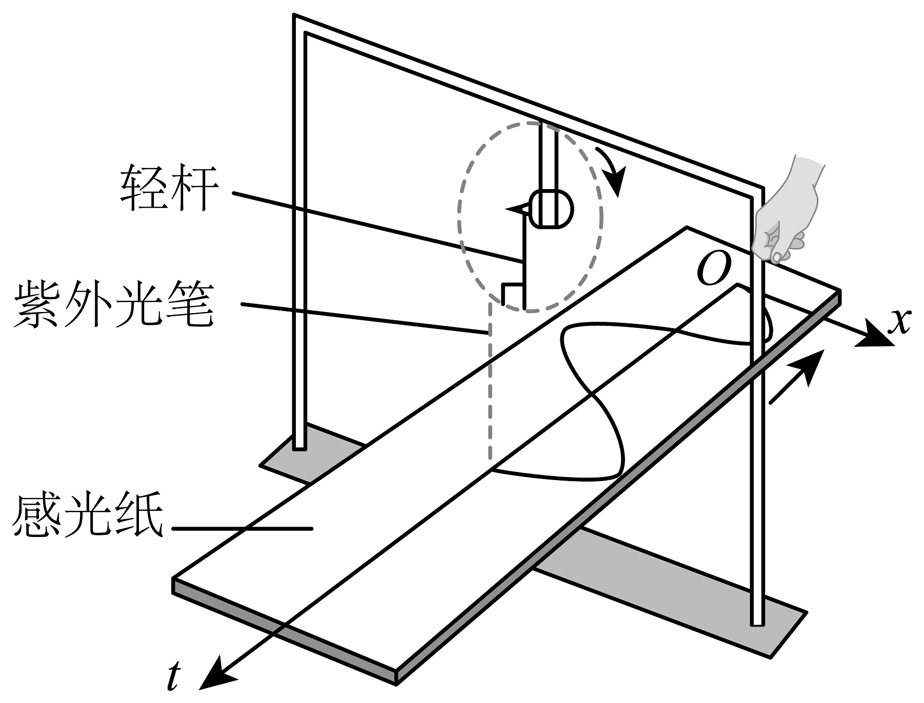 1、如图,一电动机带动轻杆在竖直框架平面内匀速转动,轻杆一端固定在电动机的转轴上,另一端悬挂一紫外光笔,转动时紫外光始终竖直投射至水平铺开的感光纸上,沿垂直于框架的方向匀速拖动感光纸,感光纸上就画出了描述光点振动的图像.已知轻杆在竖直面内长 , 电动机转速为 . 该振动的圆频率和光点在内通过的路程分别为( )A、 B、 C、 D、