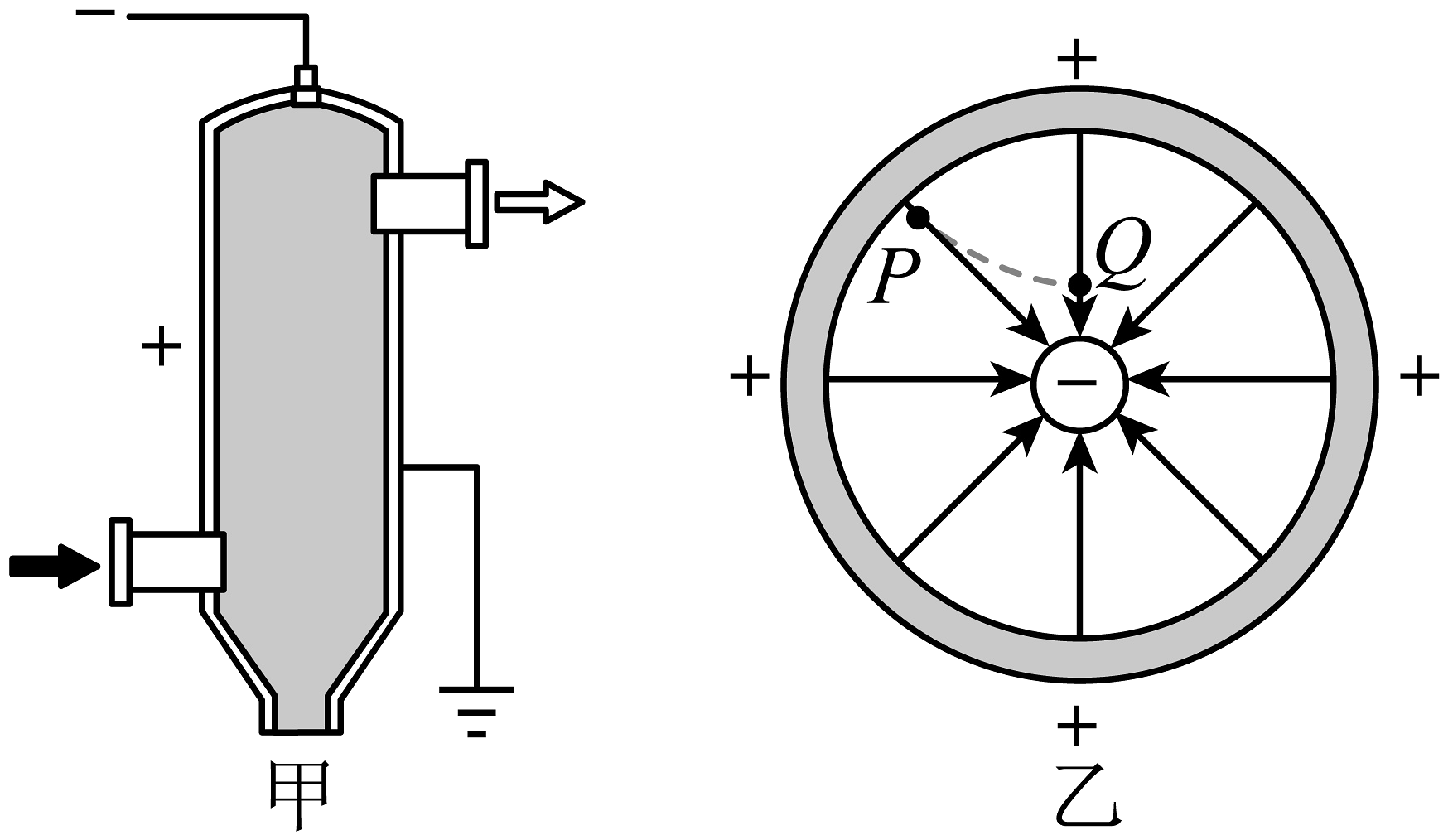 20、如图所示为静电除尘设备的结构示意图,把高压电源的正极接在金属圆筒上,负极接到圆筒中心悬挂的金属线上,其横向截面图如图乙所示,虚线PQ是某带电粉尘的运动轨迹,则该粉尘( )A、带正电荷 B、在P点的电势能比在Q点的高 C、在P点的动能比在Q点的大 D、会被吸附到金属线上