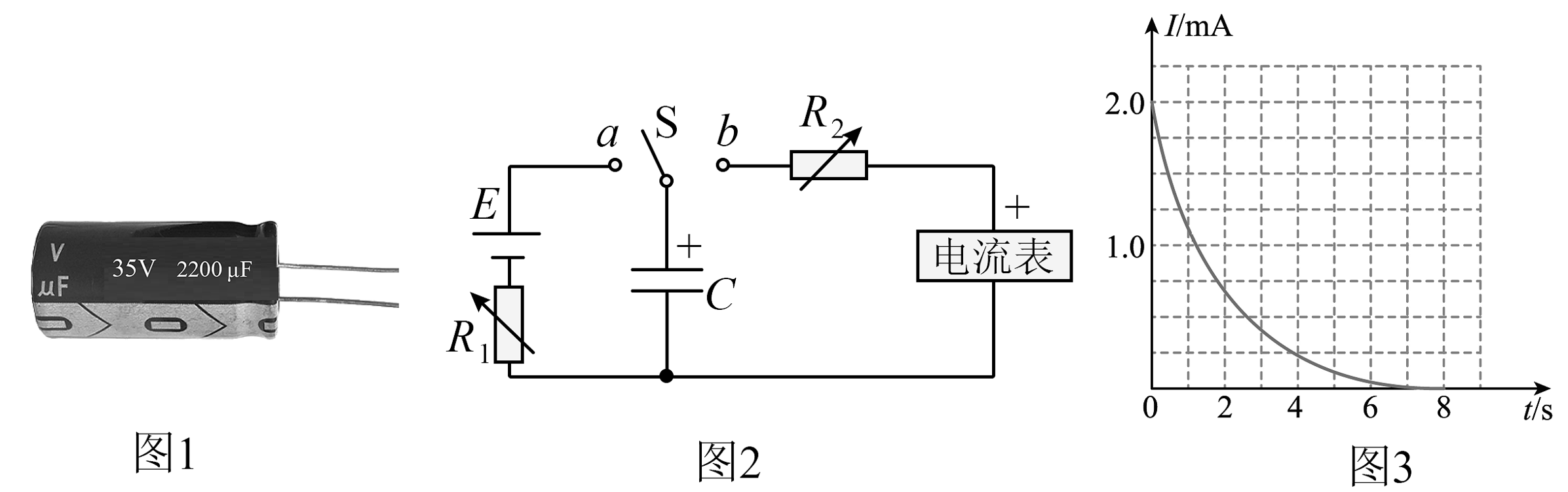 (3)、用电流传感器替换灵敏电流计,测出电路中的电流随时间变化的图像如图3所示,电源电压为8V,则电容器的电容约为F。(保留2位有效数字) -