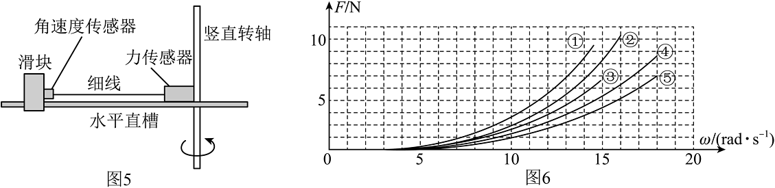 A、图2中的“探究平抛运动的特点”实验 B、图3中的“验证机械能守恒定律”实验 C、图4中的“研究平行板电容器电容大小的因素”实验(2)、实验时某同学将质量为和()的小球分别放在B、C位置,转动手柄,当塔轮匀速转动时,左右两标尺露出的格子数之比为 , 由此可知左右塔轮的半径之比为。(3)、为了进一步精确探究,小组同学利用传感器验证向心力的表达式,如图5所示,装置中水平直槽能随竖直转轴一起转动,将滑块套在水平直槽上,用细线将滑块与固定的力传感器连接。当滑块随水平直槽一起匀速转动时,细线的拉力大小可以通过力传感器测得,滑块转动的角速度可以通过角速度传感器测得。将相同滑块分别以半径r为0.14m、0.12m、0.10m、0.08m、0.06m做圆周运动,在同一坐标系中分别得到图6中①、②、③、④、⑤五条图线,则图线①对应的半径为m,各图线不过坐标原点的原因是。 -