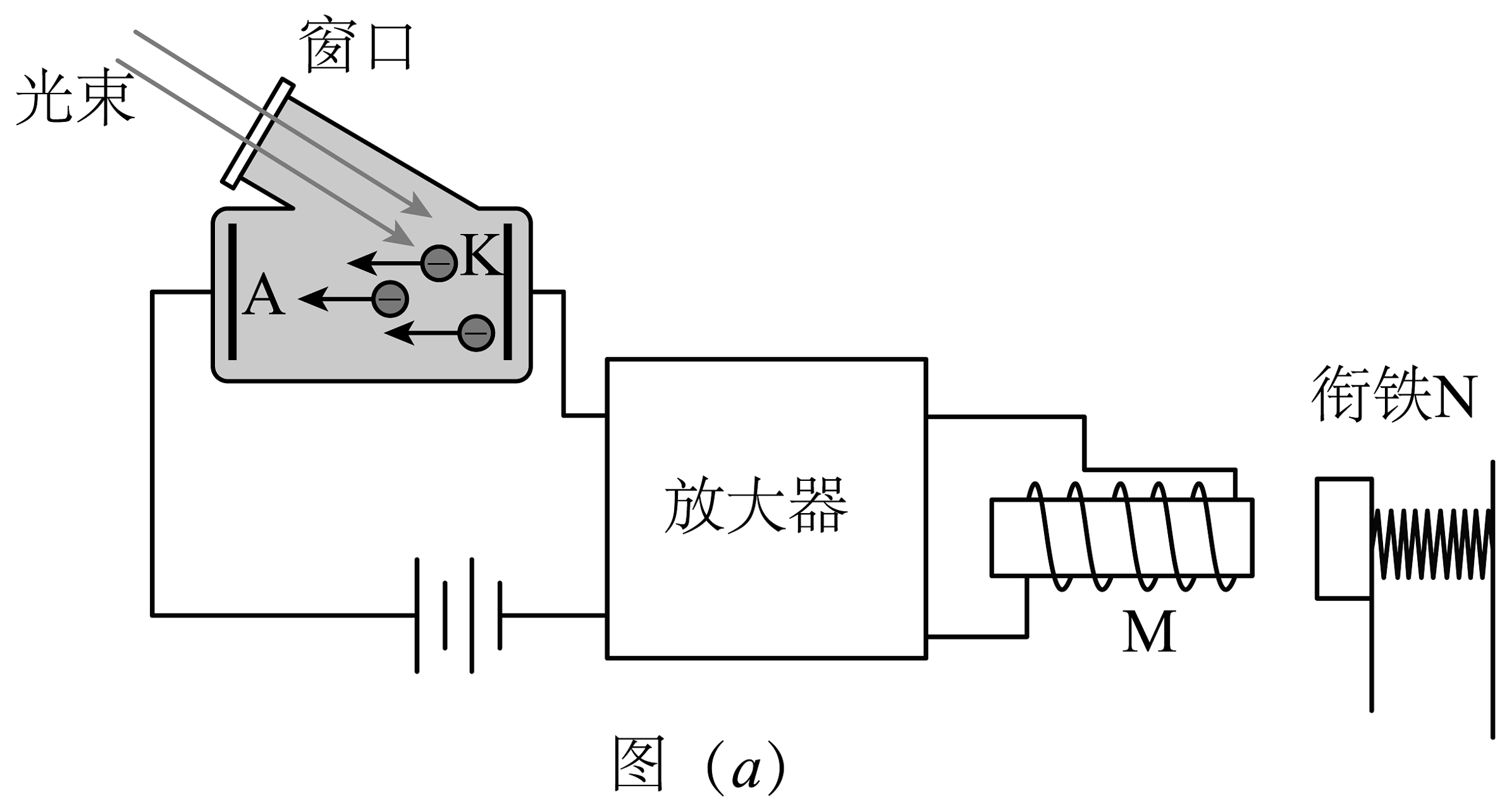 3、图(a)为工业生产中光电控制设备常用的光控继电器的示意图,电路中的光电管阴极K上涂有表(b)中的某种金属。表(b)是四种金属发生光电效应的极限频率。现用某强度绿光(500-560nm)照射光电管阴极K,铁芯M磁化,吸引衔铁N。下列说法正确的是( )
