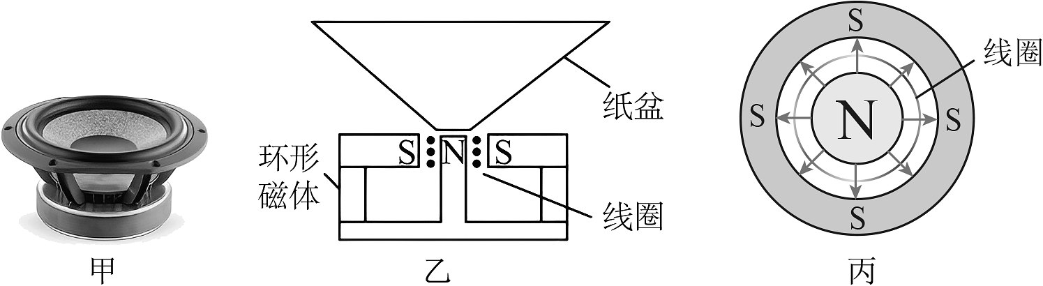 8、图甲是常见的扬声器实物图,图乙是剖面结构图,图丙是磁铁和线圈部分的俯视图。按音频变化的电流通过线圈时,线圈会带动纸盆一起振动,发出声音。则( )A、该扬声器的工作原理是电磁感应现象 B、线圈上各点位置处磁感应强度相同 C、电流变化越快则发声频率越高 D、图丙线圈电流沿逆时针时,线圈受垂直纸面向外的安培力