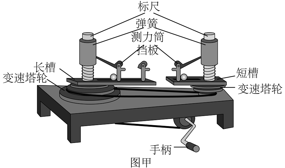 (3)、在探究小球所受向心力大小与小球转动角速度之间关系的实验中,以一定的转速匀速转动手柄,观察左右测力筒露出的刻度,左边标尺露出1格,右边标尺露出4格,如图乙所示。则皮带连接的左、右塔轮半径之比为。 -