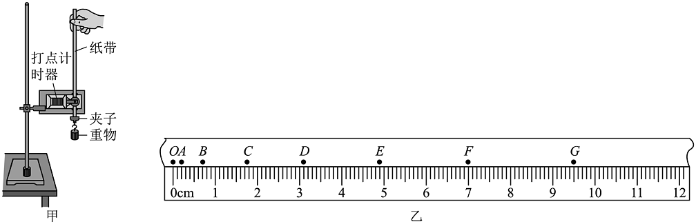 12、如图甲所示,打点计时器固定在铁架台上,使重物带动纸带从静止开始自由下落,利用此装置验证机械能守恒定律。(1)、对于该实验,下列操作中对减小实验误差有利的是__________(填标号);A、精确测量出重物的质量 B、两限位孔在同一竖直线上 C、重物选用质量和密度较大的金属锤 D、先释放重物,再接通打点计时器(2)、纸带上所打的点记录了重物在不同时刻的位置,在选定的纸带上依次取计数点如图乙所示,相邻计数点间的时间间隔 , 那么纸带的(填“左”或“右”)端与重物相连.设重物质量 , O点为打下的第一个点,则从打下O点到E点的过程中,重物动能增加量为(结果保留2位有效数字);(3)、根据纸带上的数据,算出重物在各位置的速度v,量出对应位置下落的距离h,并以为纵轴、h为横轴画出图像,则在下列A、B、C、D四个图像中,若在误差允许范围内,重物在下落过程中机械能守恒,则图像可能是(填标号)。