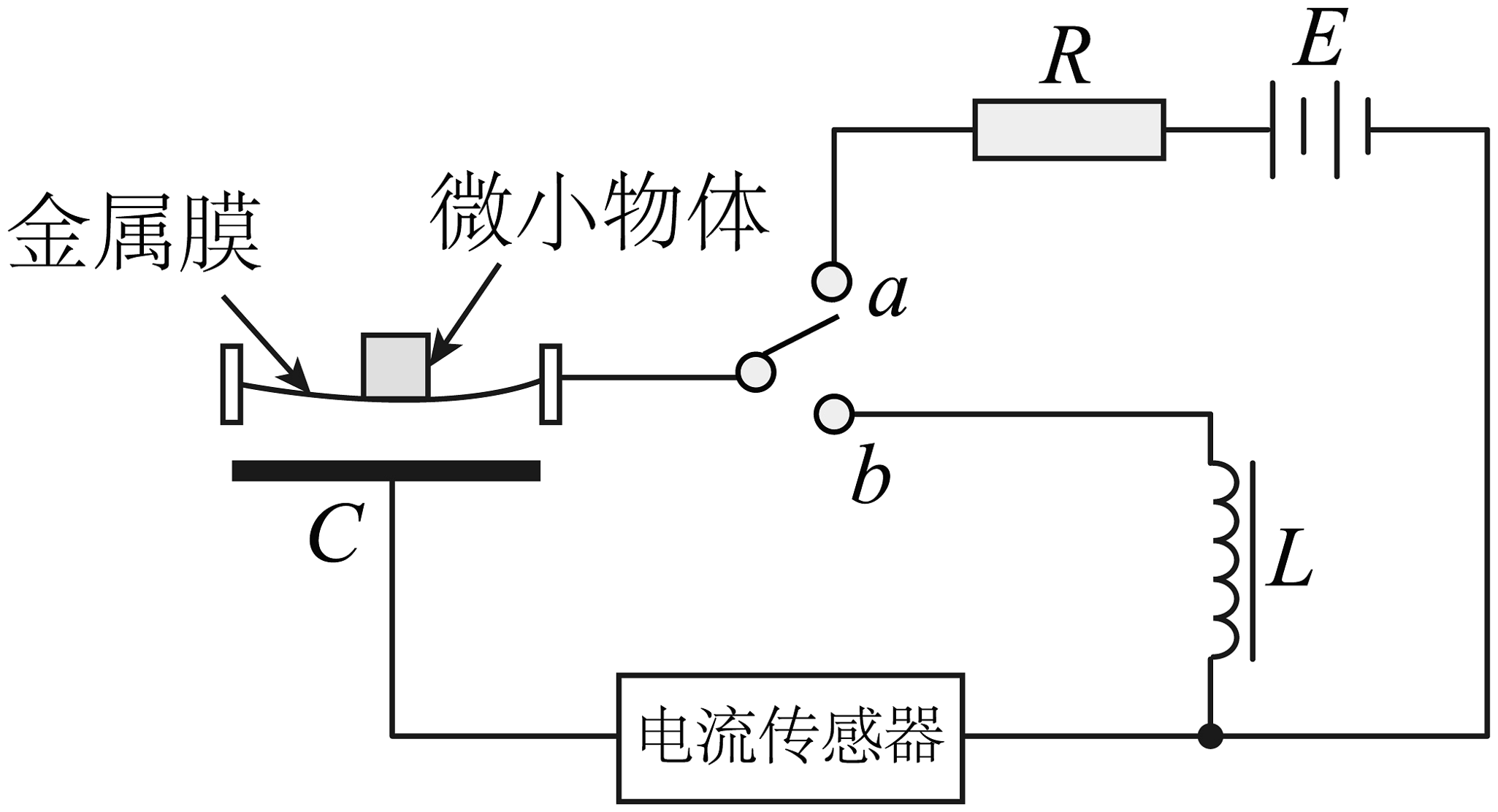 6、某人设计了如图所示的LC振荡电路来测量微小物体所受的重力,电容器的上极板是一片弹性金属薄膜,微小物体放置在金属膜中央会使其下凹,测量时先把开关拨到a,电路稳定后再把开关拨到b。通过电流传感器测出电流的频率就能测量出微小物体所受的重力。已知该电路振荡电流的频率满足以下关系式 , 则下列说法正确的是( )A、物体质量越大,开关拨向a时,电容器存储的电量越小 B、开关由a拨向b瞬间,流经电流传感器的电流最大 C、开关由a拨向b后,该LC电路发生阻尼振荡,但周期不变 D、测量时,传感器检测到的电流频率越大,表示物体质量越大