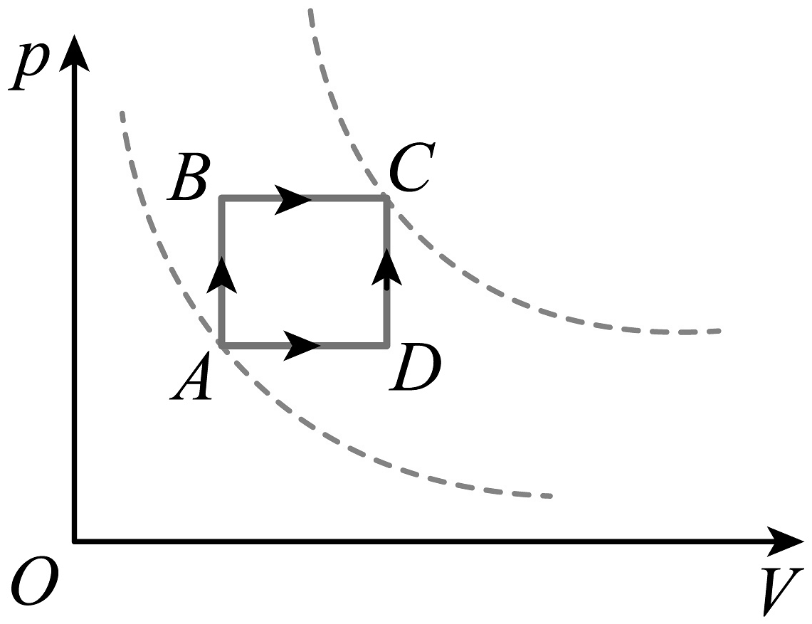 18、如图,一定质量的理想气体,原来处于A态,现经过如下两个过程变化到C态。过程一:先等容变化到B态再等压变化到C态;过程二:先等压变化到D态,再等容变化到C态。图中两条虚线代表两条等温线,则下列说法正确的是( )A、两个过程气体对外做功相等 B、两个过程气体吸收的热量相等 C、两个过程气体增大的内能相等 D、若C态的压强、体积分别是A态的2倍,则C态的热力学温度是A态的2倍