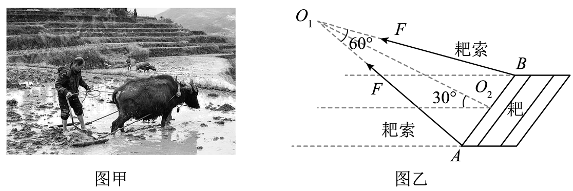 15、耙在中国已有1500年以上的历史,北魏贾思勰著《齐民要术》称之为“铁齿楱”,将使用此农具的作业称作耙。如图甲所示,牛通过两根耙索拉粑沿水平方向匀速耙地。两根耙索等长且对称,延长线的交点为 , 夹角 , 拉力大小均为F,平面与水平面的夹角为(为AB的中点),如图乙所示。忽略耙索质量,下列说法正确的是( )A、两根耙索的合力大小为F B、两根耙索的合力大小为 C、地对耙的水平阻力大小为1.5F D、地对耙的水平阻力大小为F