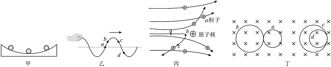19、关于下列四幅图的说法正确的是( )A、图甲:光滑圆弧面上的小球,从最低点移开很小一段距离,放手后,小球做简谐运动 B、图乙:用手上下抖动绳的一端,产生一列向右传播的横波,手开始抖动的方向竖直向上 C、图丙:卢瑟福研究粒子散射实验,说明了原子核是有内部结构的 D、图丁:静止的原子核发生衰变,a为粒子轨迹,d为粒子轨迹