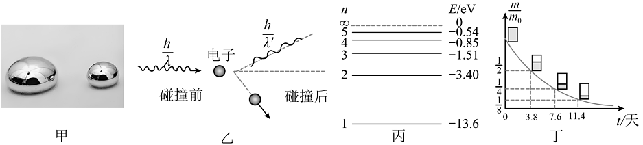 20、关于下列四幅图的说法正确的是( )A、图甲中玻璃容器中的小水银滴呈球形,是因为水银与玻璃浸润导致的结果 B、图乙为康普顿效应的示意图,入射光子与静止的电子碰撞,碰撞后散射光的波长变长 C、锌的逸出功为 , 用丙中一群处于能级的氢原子发出的光照射锌板,逸出光电子的最大初动能为 D、图丁是衰变过程随时间的变化规律,说明每个半衰期发生衰变的原子核数量相同