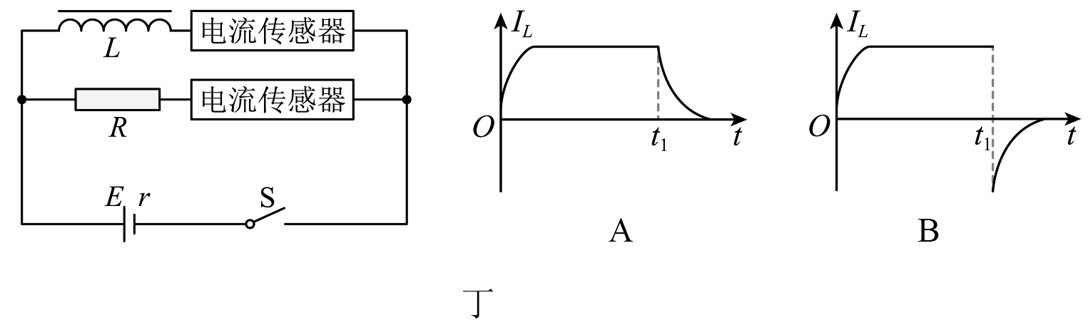 ①在时刻,闭合开关S,电路稳定后,在时刻断开S,电流传感器连接计算机描绘了整个过程线圈中的电流随时间t变化的图像。图丁中的A、B图像,可能正确的是。(选填“A”或“B”)