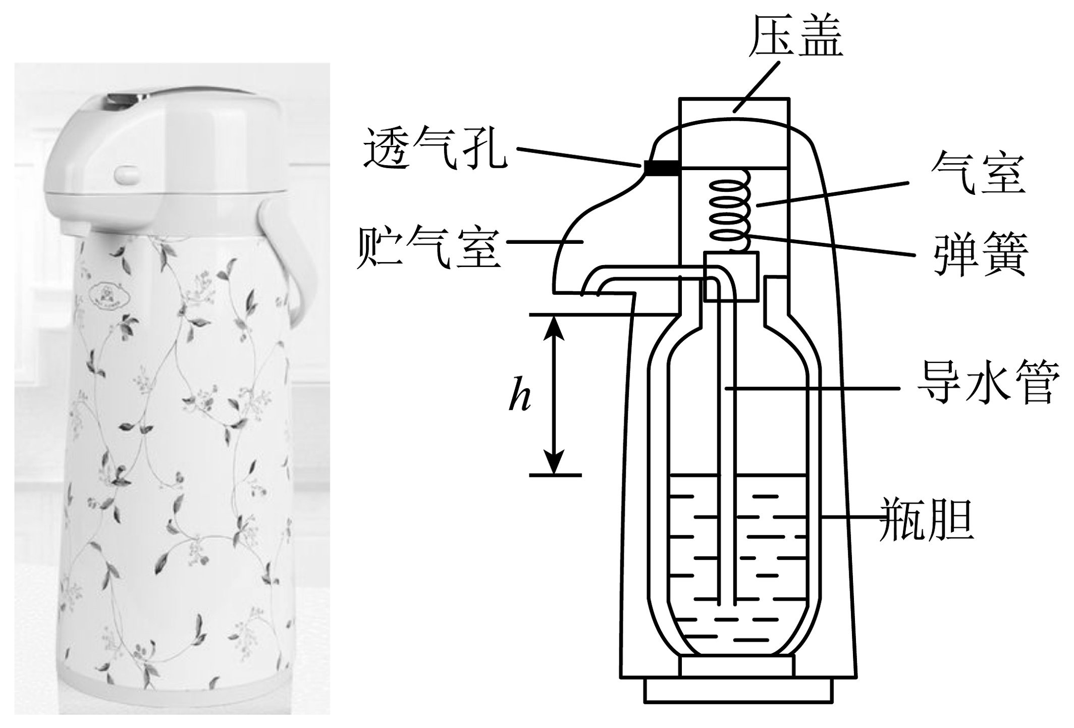 16、如图所示,是一种气压保温瓶及结构示意图。使用气压式保温瓶时,用力压保温瓶顶端的“压盖”,就可以将水压出。每次按压“压盖”,可将贮气室中气体全部压入瓶胆内,松开“压盖”,瓶胆内气体不能回到贮气室、外界空气通过进气孔重新充满贮气室。为了测量贮气室的体积,某同学先将保温瓶打开,测量了当瓶内只有半瓶水时,导水管口到瓶中水面的高度为 , 然后把保温瓶盖旋紧,该同学按压“压盖”两次后,导水口开始出水。已知保温瓶瓶胆的容积为 , 水的密度为 , 大气压强为。忽略按压过程中气体温度的变化及水管体积,保温瓶气密性良好。求贮气室的体积。