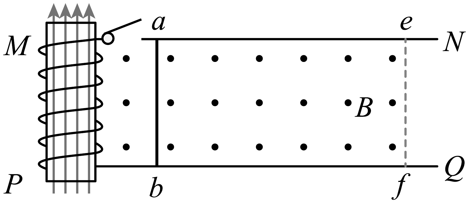 15、如图所示,两条足够长、粗糙、间距的平行金属导轨PQ、MN固定在水平面上,M、P两端间连接横截面积、匝线、总电阻的线圈。在两导轨之间、边界ef左侧区域有垂直导轨平面向上、磁感应强度的匀强磁场。导体棒ab的质量、电阻、长度也为L,垂直静置在导轨上,导体棒与导轨间的动摩擦因数。闭合开关,从某时刻起,在线圈内加图示方向、以(k未知)均匀增强的磁场 , 棒ab刚好要滑动而未动;当增大到后保持不变,之后用水平向右的外力拉棒ab,使它由静止开始运动:棒ab到达边界ef前已做匀速直线运动。棒ab始终与导轨接触良好,导轨电阻不计,忽略空气阻力,棒ab受到的最大静摩擦力等于滑动摩擦力。求:
