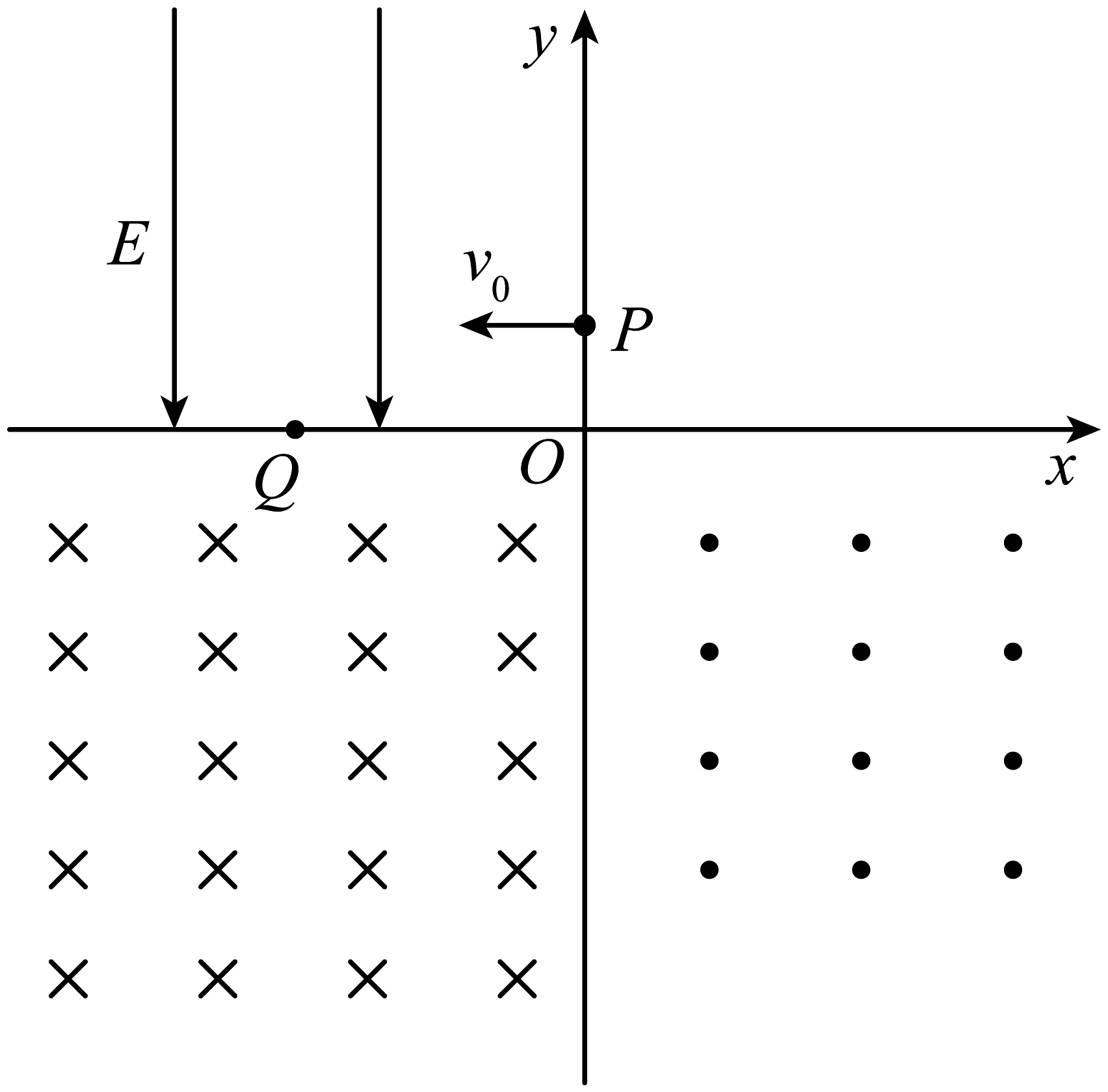 14、如图直角坐标系xOy中,在第二象限内有沿y轴负方向的匀强电场,第三象限有方向垂直于坐标平面向里的匀强磁场,第四象限有方向垂直于坐标平面向外的匀强磁场,第三、四象限的磁场下边界MN(图中未画出)在(d未知)处且平行于x轴。一质量为m、电荷量为的粒子从y轴上P点初速度垂直于y轴射入电场,经x轴上的Q点进入第三象限磁场,并垂直于y轴进入第四象限。粒子重力不计。