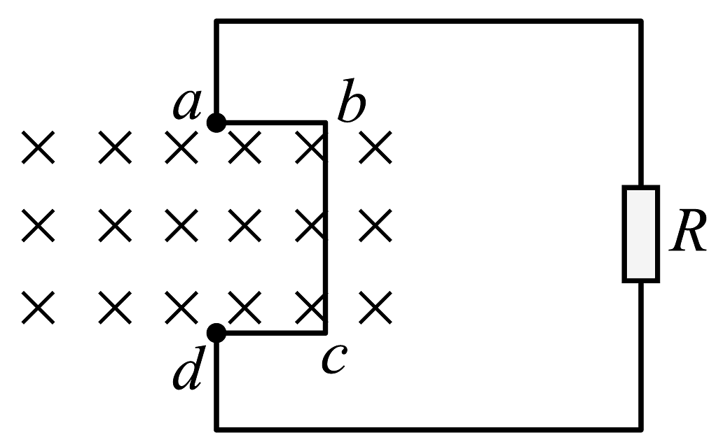 4、如图所示,电阻为r的单匝金属直角线框abcd放置在磁感应强度为B的匀强磁场中,a、d两点连线与磁场垂直,ab、cd长均为l,bc长为2l,定值电阻阻值为R。线框绕ad连线以角速度匀速转动,则( )A、图示时刻前后,电流方向相同 B、图示时刻,穿过线框磁通量的变化率最大 C、从图示时刻开始计时,a、d两点间电压变化规律为 D、从图示时刻开始转动的过程中,线圈中流过的电荷量为