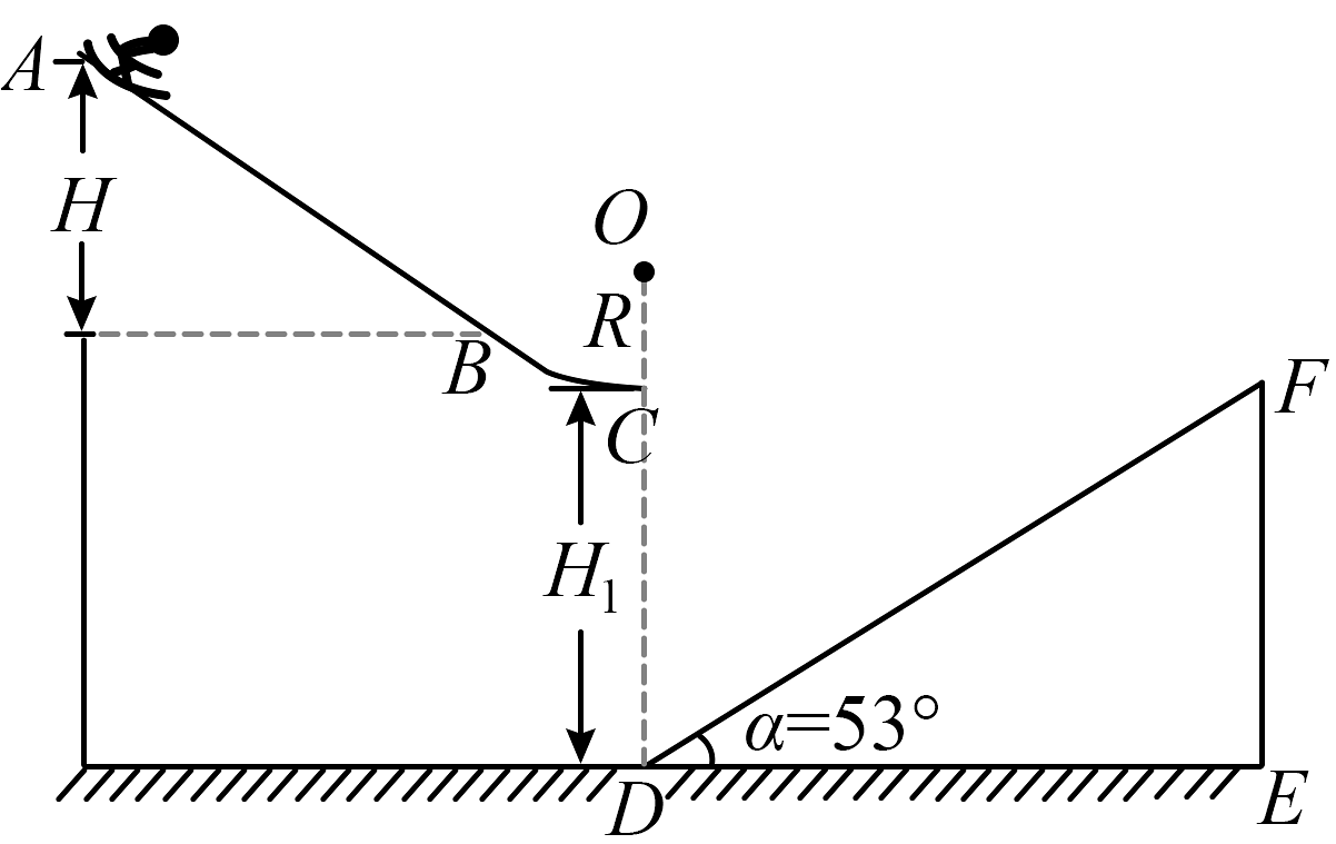 17、如图所示,跳台滑雪是冬奥会中最具观赏性的项目之一,运动员和滑雪板的总质量为m=60kg,运动员从长直助滑道AB的A处由静止开始下滑80m到达B处时的速度m/s,A与B竖直高度差为H=48m。为了改变运动员的运动方向,在助滑道与起跳台之间用半径R=15m的圆弧轨道连接,其中C为圆弧轨道的最低点,且运动员滑到C处时速度为m/s,在CD的右侧的地面上放置有一个倾角为的斜面作为运动员的着陆区,其中D在C点的正下方m处,忽略空气阻力,如图所示。()