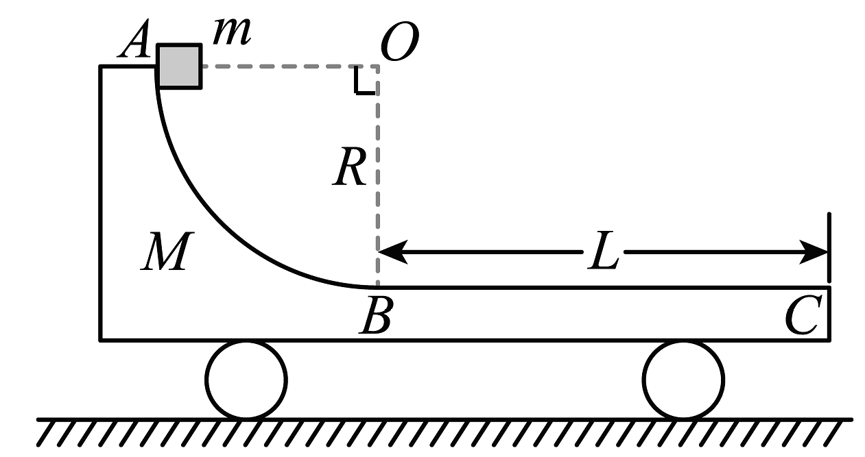 16、如图所示,质量为的小车静止在光滑水平面上,小车段是半径为的四分之一光滑圆弧轨道,段是长为L的粗糙水平轨道,两段轨道相切于B点。一质量为的可视为质点的滑块从小车上的A点由静止开始沿轨道下滑,然后滑入轨道,最后恰好停在C点,滑块与轨道间的动摩擦因数为0.5,重力加速度g取 , 则( )A、整个过程中滑块和小车组成的系统动量守恒 B、滑块由A滑到B过程中,滑块的机械能守恒 C、段长 D、全过程小车相对地面的位移大小为0.5m
