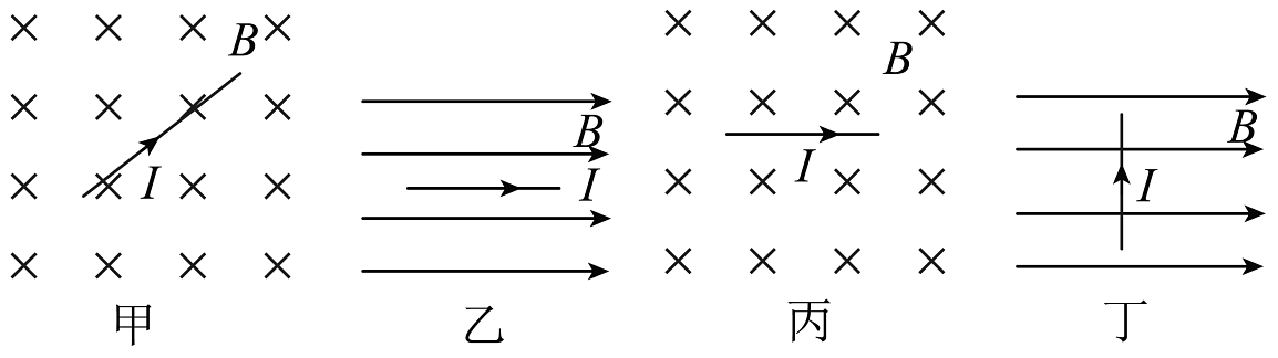 4、一段通电直导线,长度为l,电流为I,放在同一个匀强磁场中,导线和磁场的相对位置有如图所示的四种情况,通电导线所受到的安培力的大小情况将是( )A、丙和丁的情况下,导线所受到的安培力都大于甲的情况 B、乙的情况下,导线不受力 C、乙、丁的情况下,导线所受安培力大小都相等 D、甲、丙、丁的情况下,导线所受安培力大小都相等