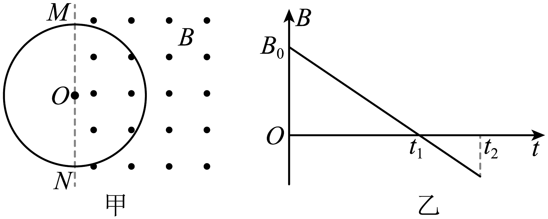 5、空间存在一方向与纸面垂直、大小随时间均匀变化的磁场,其边界如图甲中虚线MN所示,一硬质细导线圆环固定在纸面内,圆心O在MN上。t=0时磁感应强度的方向垂直纸面向外,磁感应强度B随时间t的变化关系如图乙所示。则在0~t2时间内( )A、圆环中的感应电流方向先沿顺时针,再沿逆时针 B、圆环中的感应电流方向先沿逆时针,再沿顺时针 C、圆环所受安培力的方向先向左,再向右 D、圆环所受安培力的方向先向右,再向左
