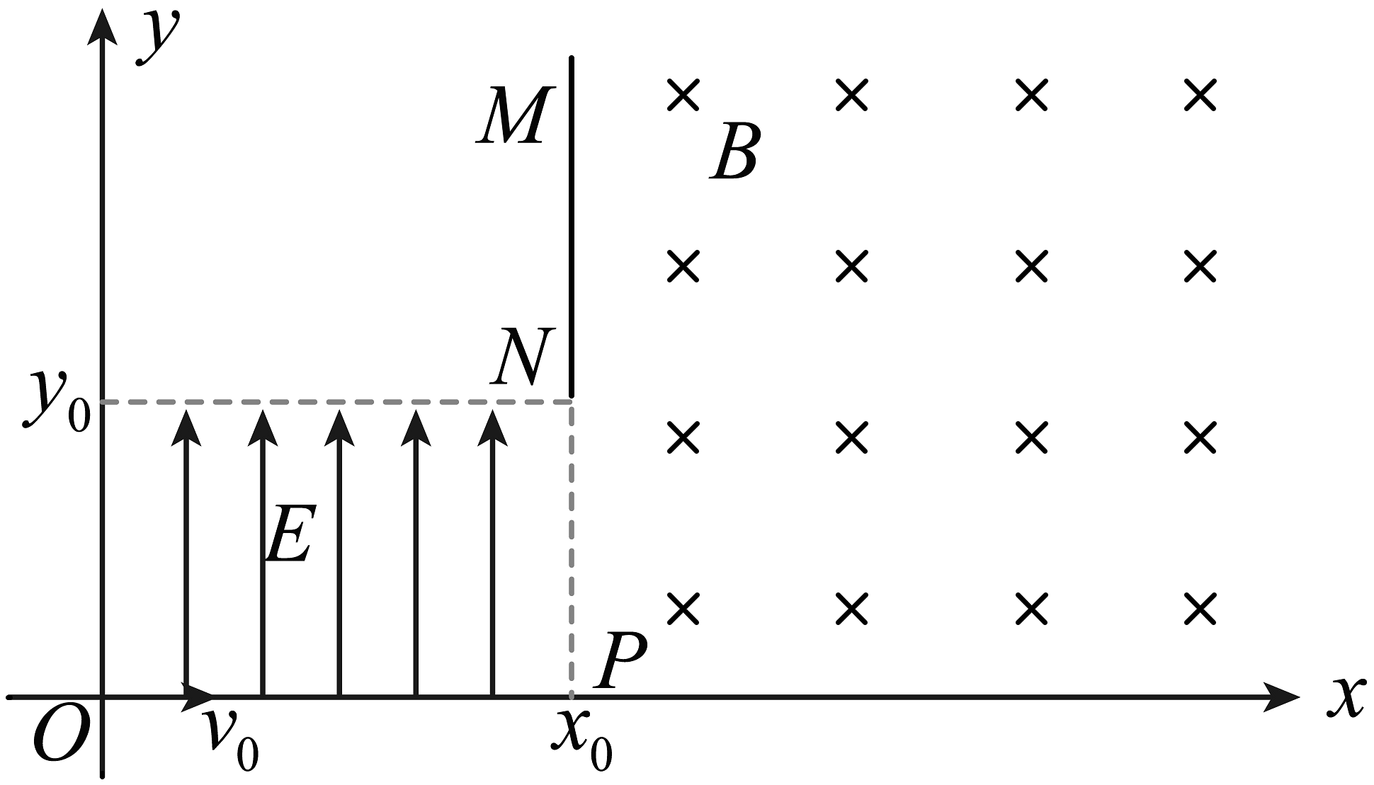 19、如图所示,质量为m,带电量为+q的点电荷,从原点以初速度射入第一象限内的电磁场区域,在 , (、为已知)区域内有竖直向上的匀强电场,在区域内有垂直纸面向里的匀强磁场B,控制电场强度(E值有多种可能),均可让粒子从NP射入磁场后偏转打到接收器MN上,则( )A、粒子从距N点的NP处射入磁场,电场强度满足 B、粒子在磁场中做圆周运动的圆心到MN的距离为 C、粒子在磁场中运动的圆周半径最大值是 D、粒子从О点到MN整个过程的运动时间是(其中的反三角函数)
