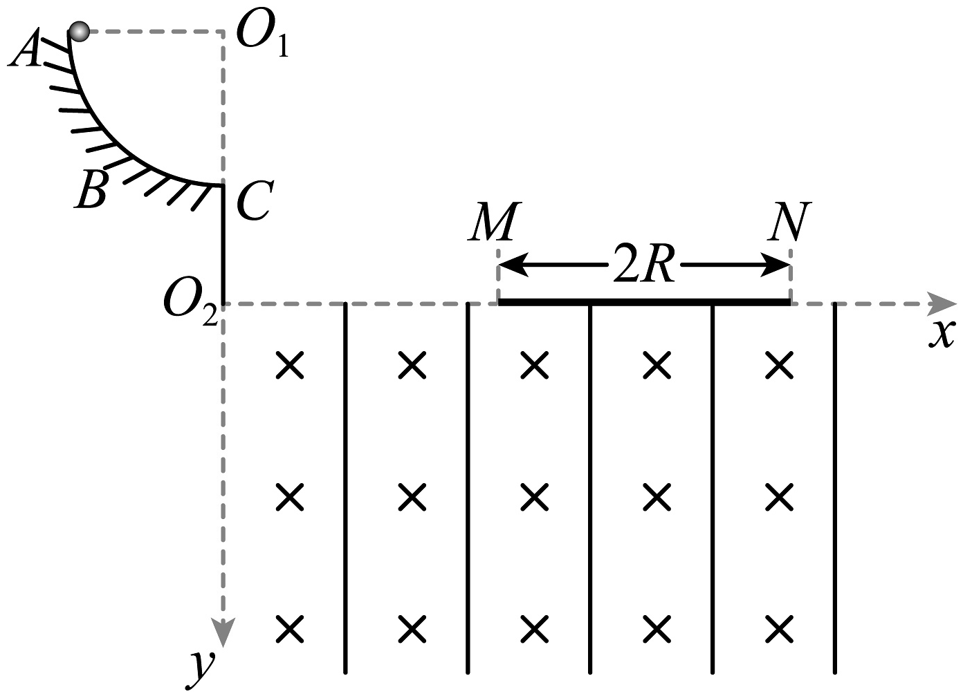 15、如图所示,直角坐标系xO2y位于竖直平面内,在x>0,y>0的区域存在竖直方向的匀强电场和垂直纸面向里的匀强磁场,磁感应强度为。将一个半径R的四分之一的光滑绝缘圆弧轨道ABC固定在竖直平面内,O1是轨道的圆心,A点与O1等高,轨道末端水平,O2C=R。将一质量为m、电荷量为q的带正电的小球,从A点静止释放,离开C点后进入到xO2y区域,在xO2y区域恰好做匀速圆周运动,重力加速度为g。求: