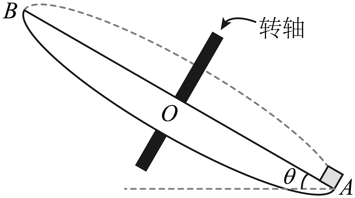 6、如图所示,一倾斜的匀质圆盘绕垂直于盘面的固定轴匀速转动,圆盘与水平桌面的夹角为 , 圆盘的半径为R,圆盘边缘处有一小物体与圆盘始终保持相对静止,物体与盘面间的动摩擦因数为 , 小物块经过圆盘的最低点A处时受到的摩擦力大小为最大静摩擦力的。已知小物块的质量为m,取最大静摩擦力等于滑动摩擦力,重力加速度大小为g,则小物块经过圆盘最高点B处时,下列说法正确的是( )A、小物块恰好不受圆盘面的摩擦力 B、小物块受到的摩擦力方向沿BO方向 C、小物块受到的摩擦力大小为 D、小物块受到的向心力大小为