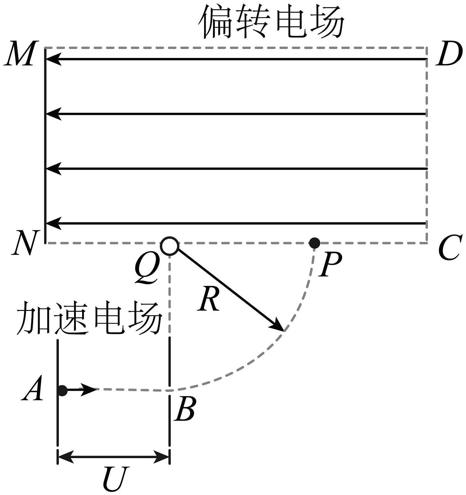 19、如图所示,静止于A处的带正电离子(电荷量为q,质量为m),经电压为U的加速电场加速后从B点飞出,恰好以源电荷Q(可视为点电荷)为圆心、半径为R的四分之一圆做匀速圆周运动,并从P点垂直于边界CN进入矩形有界匀强偏转电场,电场方向水平向左,离子恰好能打在M点。已知NP间的距离等于NM间距离,离子的重力不计,源电荷Q产生的电场对加速电场和偏转电场均无影响,静电力常量为k。求: