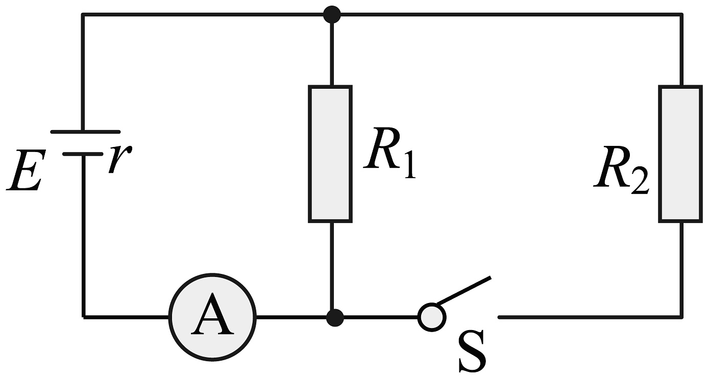 10、如图所示的电路中,电源的电动势E = 20V,R1= R2= 6Ω,当电键S断开时,理想电流表的示数I1= 2.5A。求: