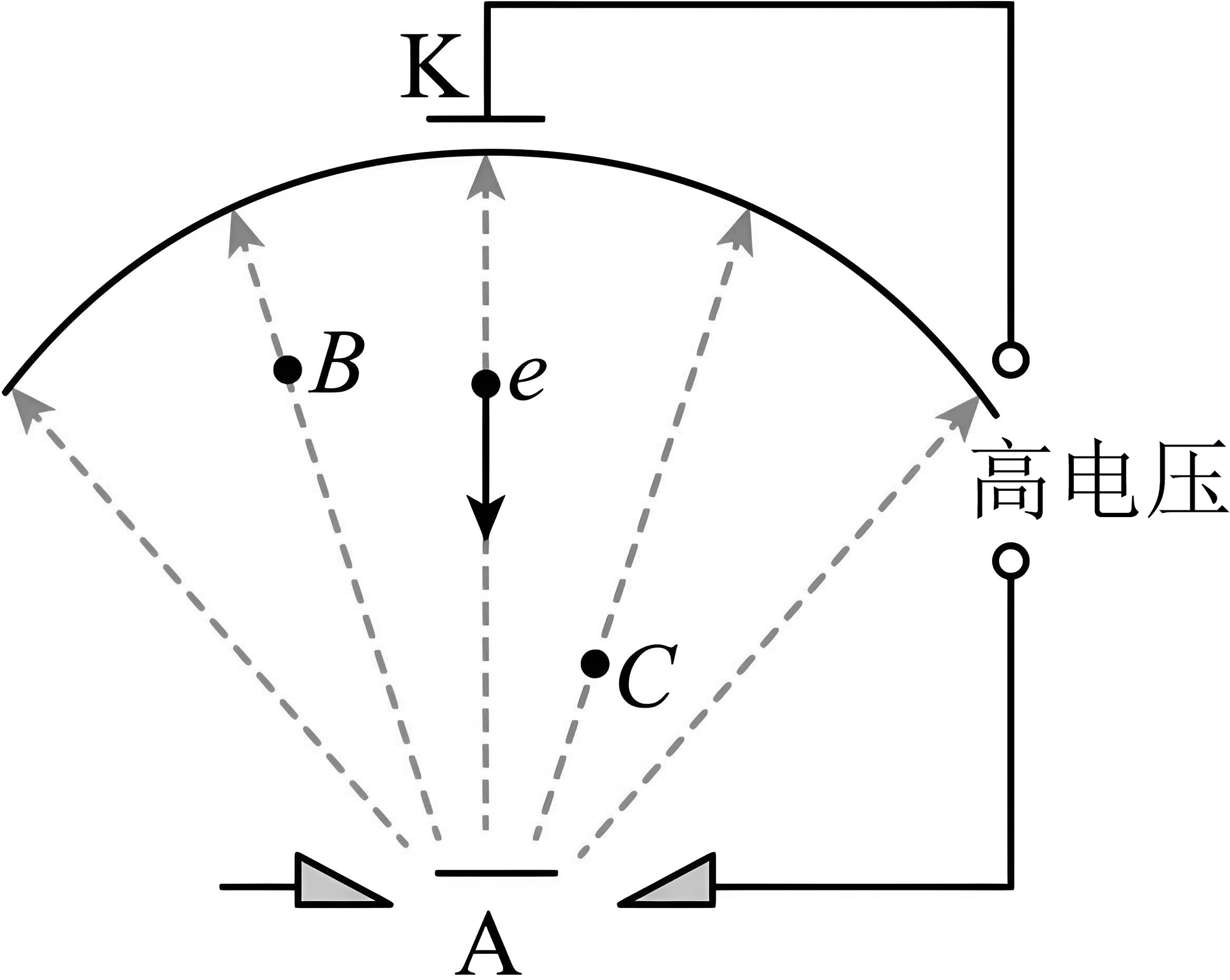 16、如图所示为电子束焊接机,K为阴极,A为阳极,两极之间的距离为 , 在两极之间加上高电压 , 两极之间形成了辐向分布的电场,图中带箭头的虚线代表电场线,、是电场中两点。有一电子在K极由静止被加速,不考虑电子重力,元电荷为 , 则下列说法正确的是( )A、A、K之间的电场强度均为 B、点电势小于点电势 C、点电场强度大于点电场强度 D、电子由K到A的电势能增加了
