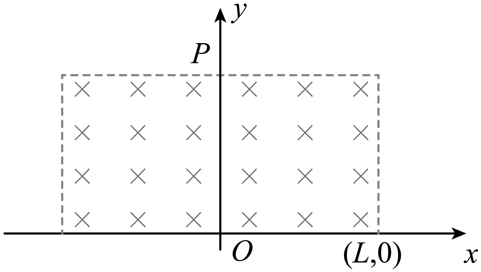 5、如图所示,在长为2L,宽为L的矩形区域内,有相互垂直的匀强电场(图中未画出)和匀强磁场,电场方向沿x轴正方向,磁场方向垂直于xOy平面向里。一质量为m、带电荷量为q的带电粒子从O点沿y轴正方向以一定速度射入,带电粒子沿直线运动,经时间t0从P点射出,若仅撤去电场,带电粒子依然经t0射出矩形区域,不计粒子受到的重力,则匀强磁场的磁感应强度大小为( )A、 B、 C、 D、