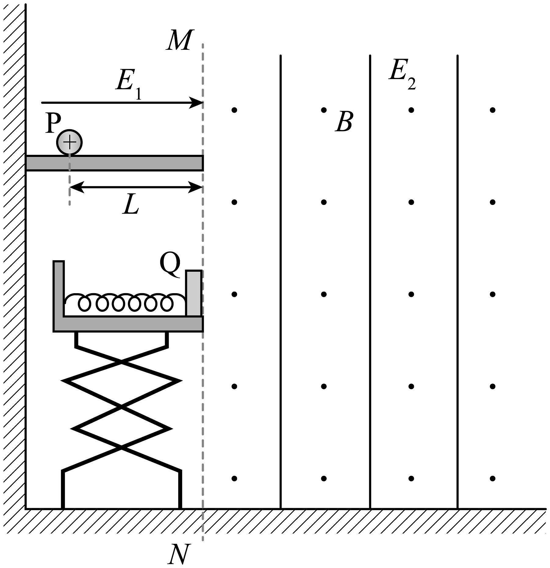 19、如图,距地面高为的光滑绝缘平台上存在一水平向右、场强为的匀强电场,紧接平台右侧有一以MN为分界线的复合场,其中匀强电场的场强是竖直方向的、大小和具体方向未知,匀强磁场的磁感应强度为 , 方向垂直于纸面向外;距离平台下方有一可自由升降的光滑平台,平台左侧安装一竖直挡板,一条轻质弹簧,左端固定于挡板上,右端固定一个质量为的接收板。现在最上方平台距离右端为处轻轻释放一质量为、电量为的带电小球 , 在电场力作用下向右运动,进入复合场后做匀速圆周运动,重力加速度取 , 忽略各场的边缘效应,小球视为点电荷。(1)、求进入复合场时速度的大小;(2)、求匀强电场的场强大小和方向;(3)、若的值是可变的,要使能打中并粘连(时间极短),试讨论两个平台之间的高度差与的关系,并求出弹簧的最大弹性势能(均在弹性限度内)。