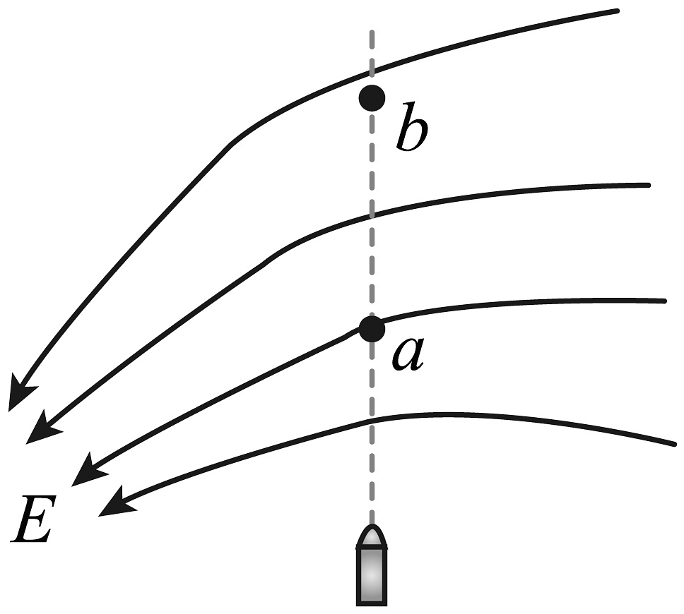 9、我国每年都多次发射载有卫星的火箭。火箭升空过程中由于与大气摩擦产生了带正电的静电。由于宇宙射线而使天空一些区域产生静电场。假设有一电场如图所示,火箭沿竖直方向穿过电场,取轨迹上的点和点,火箭可视为点电荷,下列判断正确的是( )A、点的电势比点的高 B、点的电场强度比点的大 C、火箭在点受到的电场力比在点的小 D、火箭在点具有的电势能比在点的大