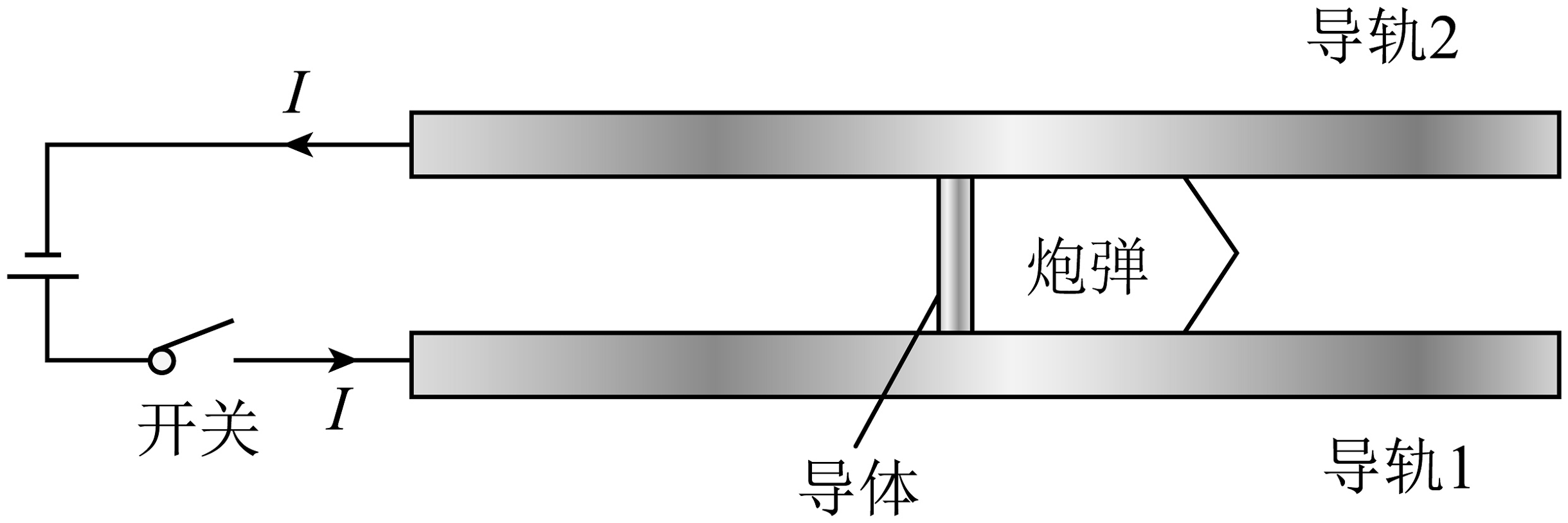 7、电磁炮原理如图所示。闭合开关,电源提供的强大电流从固定的光滑导轨1流入,从光滑导轨2流回,导轨中电流在导轨间产生磁场,装在炮弹后面的导体棒在安培力作用下把炮弹向右发射。假设导轨中的电流为 , 两导轨之间可视为匀强磁场,磁感应强度与电流的关系为 , 两导轨间的距离为 , 每条导轨长度为 , 炮弹总质量为 , 不考虑导体棒切割磁感线产生的感应电动势,下列分析正确的是( )A、两导轨间的磁场方向垂直纸面向内 B、导轨与导轨之间的安培力是吸引力 C、炮弹运动的加速度大小为 D、炮弹获得的最大动能为