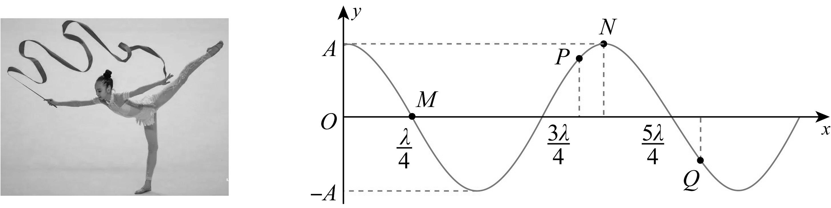 6、“带操”是一项将运动与艺术完美结合的体育竞技项目,运动员通过舞棍带动彩带展示不同的形状,形成机械波。某时刻彩带的形状绘制成如图所示的波形图,波形图近似为正弦函数图象且波沿轴正向传播,取四个质点、、、、在轴,在波峰,与到轴距离相等,以下说法正确的是( )A、正在向上振动且速度最大 B、的加速度最大且方向向下 C、质点比先经过平衡位置 D、运动员舞棍的频率越快,波的传播速度也越快