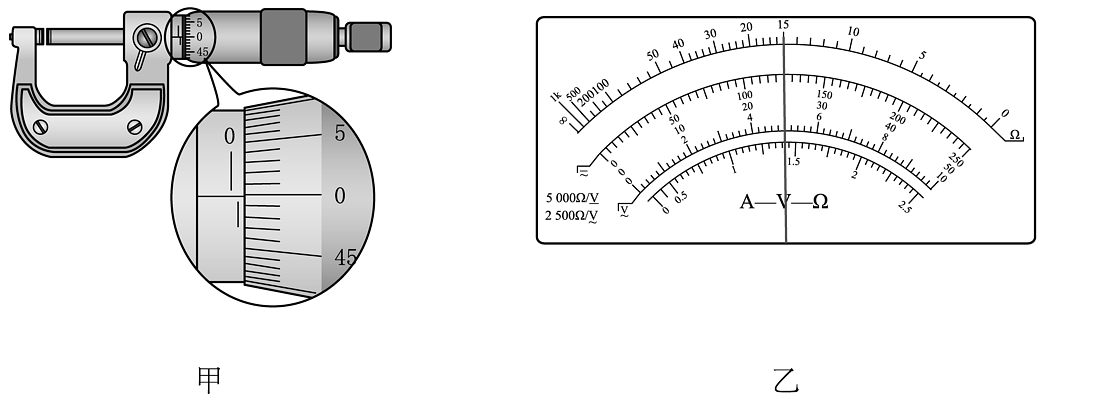 3、某同学在“测量金属导体的电阻率”的实验中,(1)、用螺旋测微器测量某导体直径,如图甲所示,则读数为mm。(2)、用多用电表“”档测量该导体(全长)的电阻,表盘指针如图乙所示,则读数为。(3)、用刻度尺测量该导体(全长)的长度,如果长度、直径、电阻的符号分别为、、 , 则该导体电阻率的表达式。