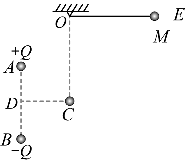 10、如图所示,固定于同一条竖直线上的A、B是两个带等量异种电荷的点电荷,电荷量均为Q,其中A带正电,B带负电,D、C是它们连线的垂直平分线,A、B、C三点构成一边长为d的等边三角形。另有一个带电小球E,质量为m、电荷量为+q(可视为点电荷),被长为L的绝缘轻质细线悬挂于O点,O点在C点的正上方。现在把小球E拉到M点,使细线水平绷直且与A、B、C处于同一竖直平面内,并由静止开始释放,小球E向下做圆周运动到最低点C时,速度为v(已知静电力恒量为k,取D点的电势为零),试求: