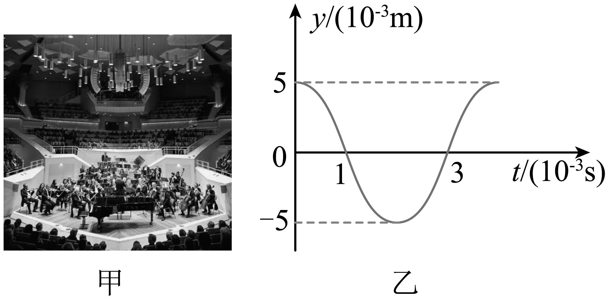 5、如图甲所示,在音乐厅中,小提琴抒情醇美,音域较宽,大提琴气势宏大,具有宽广的中音域。音乐厅中各种乐器相互配合,让听众体验音乐的美妙与魅力。图乙为小提琴琴弦某次振动的图像。下列说法正确的是( )A、频率越高的声音越容易发生明显的衍射现象 B、小提琴和大提琴发出的声波会产生明显的干涉现象 C、音乐厅中的声音传进墙面上的吸音材料后频率会改变 D、小提琴某根琴弦的某次振动函数表达式为