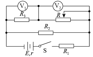 3、如图所示,R1、R2和R3都是定值电阻,R是滑动变阻器,V1和V2是两理想电压表,闭合开关,当滑动变阻器的滑片自图示位置向左缓慢滑动时,下列说法中正确的是( )A、电压表V1示数减小 B、电压表V2示数增大: C、电阻R2消耗的电功率增大 D、电压表V1示数的变化量∆U1的绝对值小于电压表V2示数的变化量∆U2的绝对值