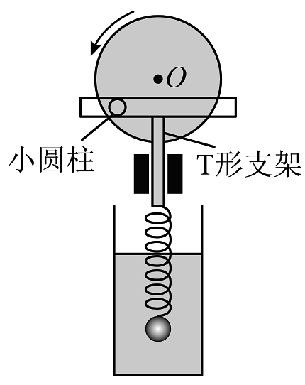 8、如图所示,竖直圆盘可绕水平中心轴O转动,固定在圆盘边缘上的小圆柱带动一个T型支架在竖直方向振动,T型支架下端连着一个弹簧振子,小球始终在水中,当圆盘静止时,小球阻尼振动的频率约为3Hz。现使圆盘以4s的周期匀速转动,当小球振动达到稳定后( )A、小球的振动频率约为3Hz B、T型支架的运动是简谐运动 C、小球的振幅与圆盘转速无关 D、若圆盘匀速转动的周期变为2s,稳定后小球的振幅将减小