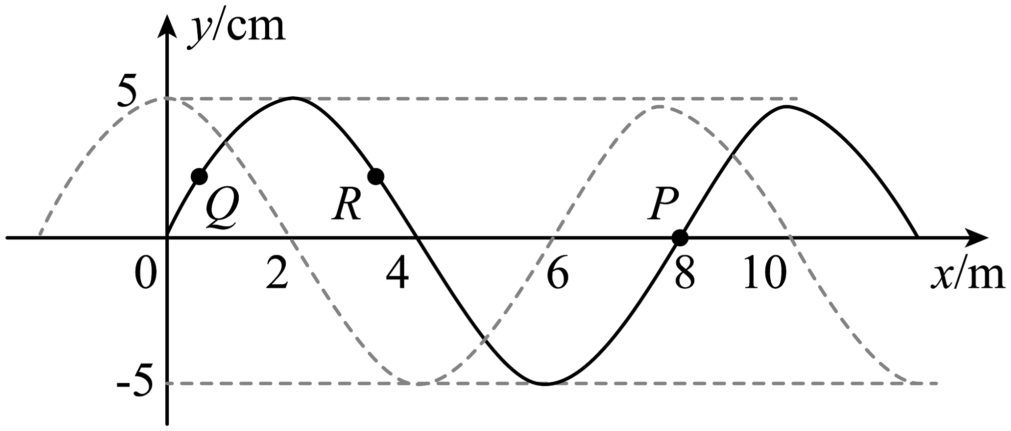 2、一列正弦波在t=0时刻的波形图如图中实线所示,在t=3s(T<3s<2T,T为波的周期,T未知) 时刻的波形图如图中虚线所示。求:(1)、若从0时刻起,图中质点R比Q先回到平衡位置,判断波的传播方向并写出P点的振动方程;(2)、该波可能的传播速度大小v。
