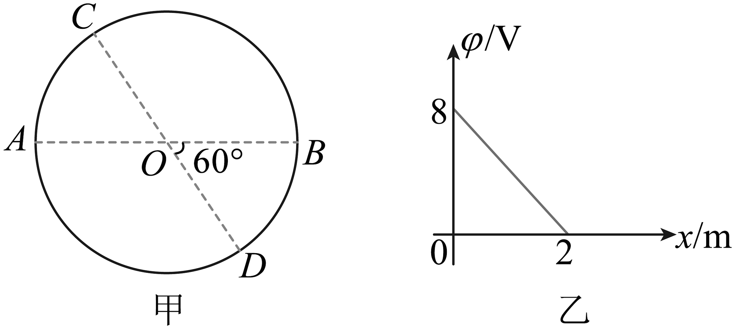 13、如图甲所示,圆形区域存在与圆平面平行的匀强电场E(图中未画出),圆的两条直径AB与CD间的夹角为 , 从A点向圆形平面内不同方向发射速率相同的质子(不计质子间相互作用),发现从圆边界射出的粒子中D点射出的粒子速度最大。以A为坐标原点。沿AB方向建立x坐标轴,B点的坐标为 , x轴上从A到B的电势变化如图乙所示,则( )A、CD间电势差 B、CD间电势差 C、电场强度 D、电场强度