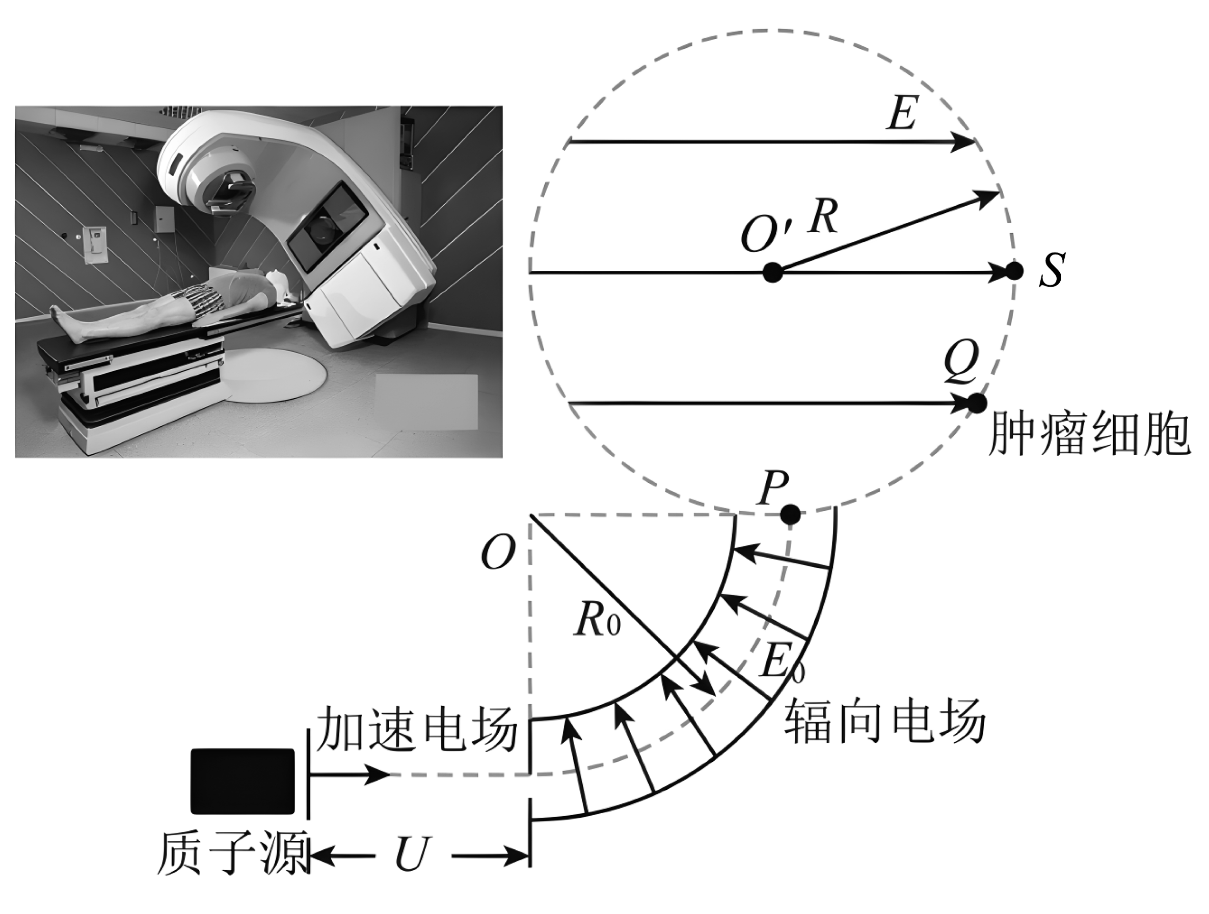 5、某些肿瘤可以用“质子疗法”进行治疗。如图所示,来自质子源的质子初速度为零,经加速电压U(U未知)加速后,沿图中四分之一圆弧虚线通过辐向电场,再从P点竖直向上进入存在水平向右的匀强电场的圆形区域,最终轰击处在圆上Q点的肿瘤细胞。已知四分之一圆弧虚线处的场强大小为 , 方向均沿半径指向圆心O,圆与OP相切于P点, , 圆形电场区域的半径为R,Q点位于OP上方处,S点位于OP上方R处,质子质量为m、电量为e。不计质子间相互作用。求:(1)、质子在辐向电场做匀速圆周运动的速度大小v,加速电场的电压U。(2)、质子轰击到Q点的肿瘤细胞时对应匀强电场的场强大小E;(3)、若将加速电压改为原来倍,其它条件不变,试通过计算分析质子能否击中位于圆上S处肿瘤细胞。