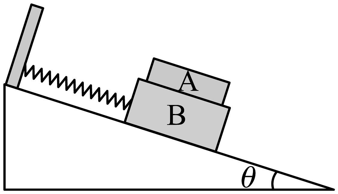 20、如图所示,倾角的光滑斜面固定,劲度系数为k的弹簧左端固定,右端与质量,为m的木块B连接,B上放置一质量为m的小铁块A,A、B间动摩擦因数为 , 重力加速度为g。在弹簧原长时,静止释放A、B,释放后A、B始终能保持相对静止。(1)、求弹簧的最大伸长量L;(2)、求运动过程中A所受摩擦力的最大值f;(3)、若改变释放点,A、B刚好不脱离,求运动过程中A动能的最大值。