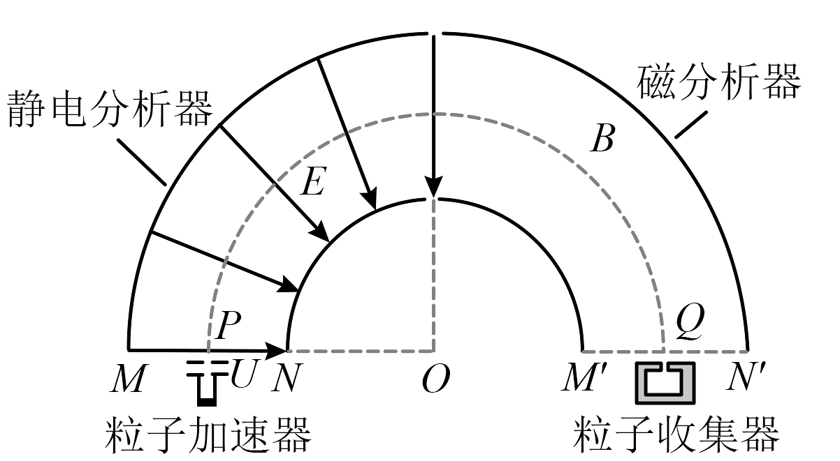 13、如图是某种质谱仪的结构示意图,以O为圆心的半环形通道,左侧四分之一环形通道为静电分析器,其内有沿半径方向均匀辐射的电场,电场强度E与到圆心距离r的关系满足(k未知);右侧四分之一环形通道为磁分析器,其内分布着磁感应强度大小为B、方向垂直于纸面的匀强磁场。某一静止的电荷量大小为q、质量为m的粒子,经粒子加速器(可左右平移)的加速电压U加速后垂直MN进入静电分析器,均恰好能以O为圆心做匀速圆周运动.已知 , 不计粒子重力,不考虑电场与磁场间的相互作用.(1)、请判断粒子的电性和磁场的方向(不需要说明理由);(2)、求k的大小;(3)、若从MN的中点P进入的粒子恰能沿同一半径的圆弧进入粒子收集器,求该粒子的比荷。